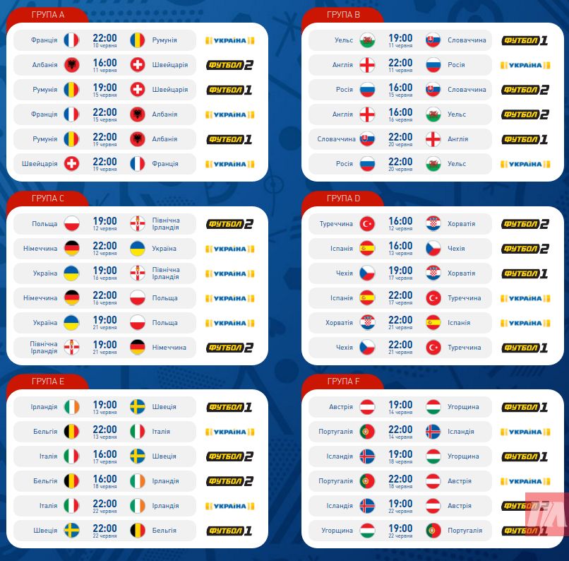 Матчи группового раунда Евро 2016 будут идти до 22 июня. Все поединки будут транслировать такие украинские телеканалы: Украина, Футбол-1 и Футбол-2.
