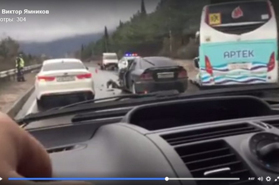 Пользователь Виктор Ямников разместил на своей странице в Facebook видео, из которого следует, что легковой автомобиль столкнулся с автобусом, принадлежащем «Артеку». Видно как к месту происшествия подъезжает машина «Скорой помощи» с включенными проблесковыми маячками.