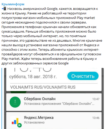 «Приложения в телефонах крымчан начали обновляться как сумасшедшие. Раньше обновить приложения можно было только через мобильный интернет, но, по понятным причинам, это удовольствие не из дешевых. Многие крымчане нашли выход в установке магазина приложений от Яндекса и спокойно с этим жили. Теперь абоненты крымских интернет-провайдеров могут обновляться и в официальном гугловском Play market (Google Play — ATR)» — говорится в сообщении.