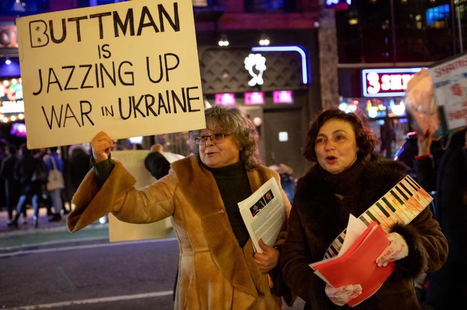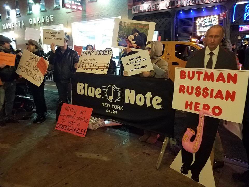 Украинцы в Нью-Йорке четыре вечера подряд устраивали акции протеста перед выступлениями джазмена Игоря Бутмана, поддержавшего аннексию Крыма.