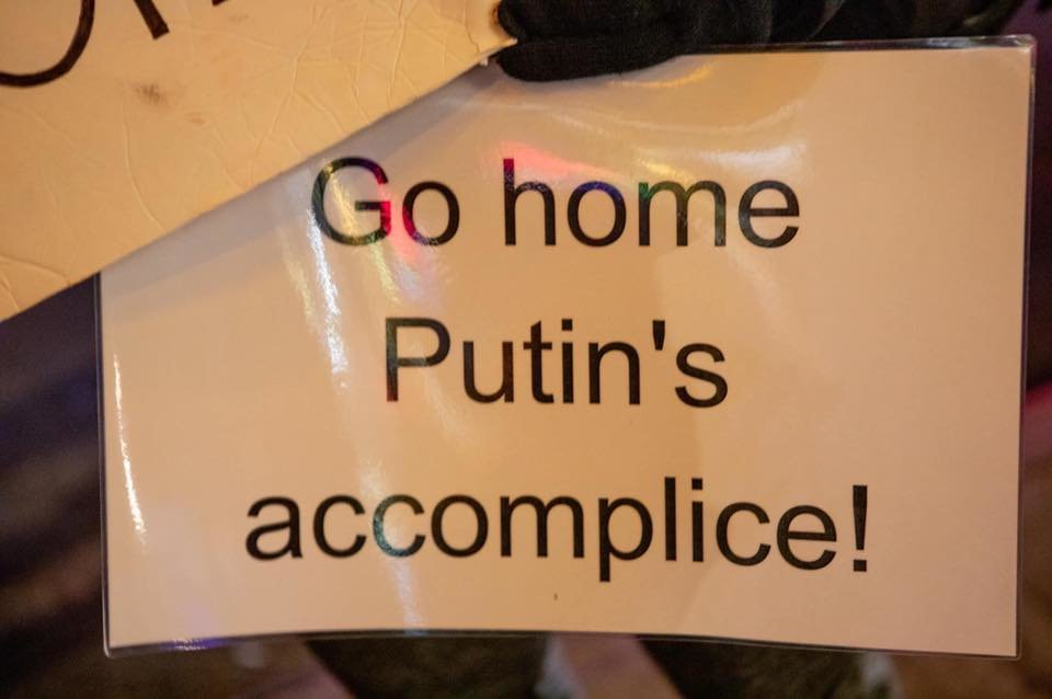 Активисты стояли с плакатами «Не играй в дудку Путина», «Крым — это Украина», «Позор Blue Note» [ночной клуб], «Не играй по нотам Путина», «Путин, убери руки от Украины», «Остановите вирус российской пропаганды» и другие.