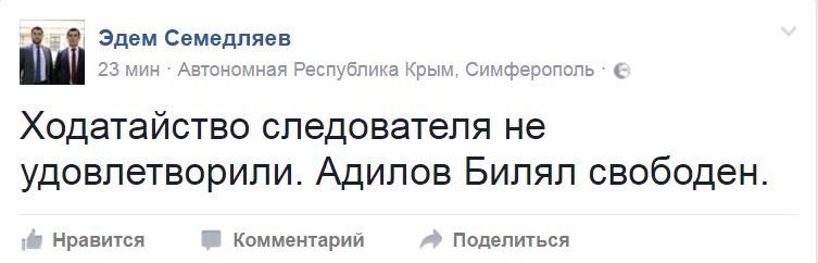 Адвокат Эдем Семедляев на своей странице в Facebook сообщил, что «суд» не удовлетворил ходатайство следователя и активиста освободили.