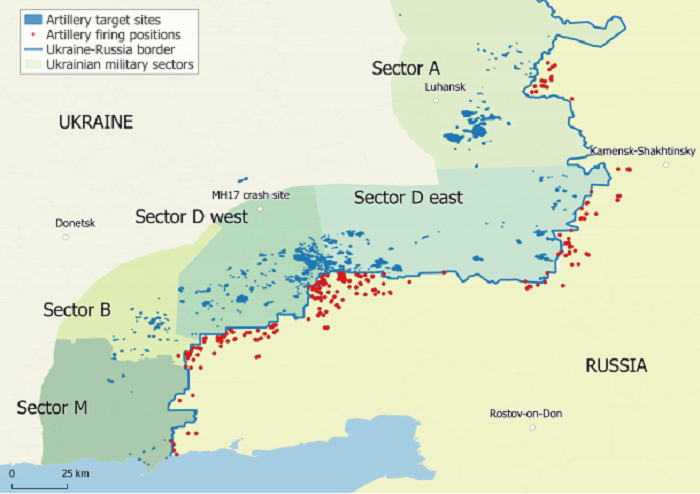 В отчете, опубликованном на сайте Bellingcat, сообщается, что россияне провели как минимум 149 обстрелов украинской территории летом 2014 года. 130 мест в докладе отмечены как вероятные позиции российской артиллерии. Число выпущенных летом 2014 года снарядов, по информации группы, составляло тысячи единиц.