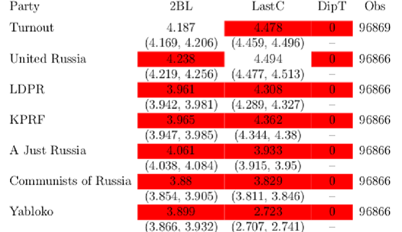 «Два этих показателя идеальны. Похоже, русские говорят ученым, что они хорошо умеют фальсифицировать данные о выборах», – сказано в исследовании.