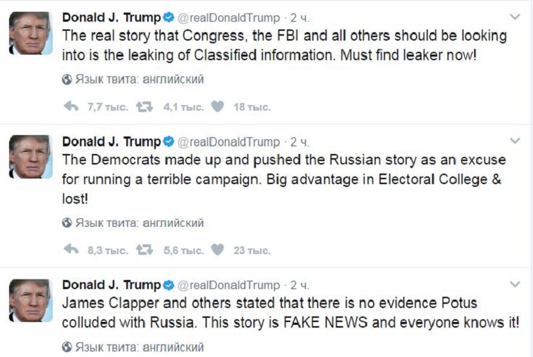 «Джеймс Клэппер и многие другие заявили, что нет никаких доказательств того, что я вступил в сговор с Россией. Эта история является выдуманной, и все это знают! Реальность заключается в том, что конгресс, ФБР должны рассматривать это как утечку секретной информации. Необходимо найти источник!».