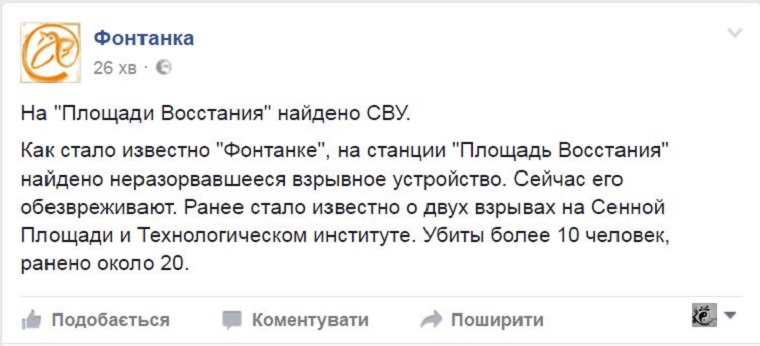 В то же время, как сообщает питерское издание «Фонтанка» в Фейсбук, на станции метро «Площадь Восстания» обнаружено несработавшее взрывное устройство. На месте происшествия работают саперы.