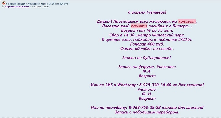 Сообщение о том, что людей на митинг и концерт памяти жертв теракта в метро Петербурга приглашают за определенную плату, появились на сайте «Массовки.Ру».