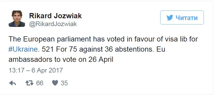 Послы стран ЕС, то есть, когда Комитет постоянных представителей стран-членов ЕС (COREPER) утвердит безвиз для Украины, проголосуют 26 апреля. Об этом в своем Twitter написал брюссельский корреспондент «Радио Свобода» Рикард Йозвяк.