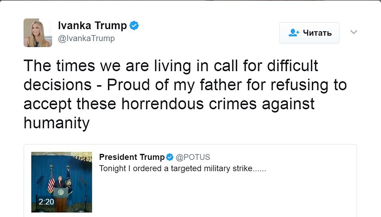 На своей странице в Twitter Иванка Трамп написала, что приказ ее отца, президента США Дональда Трампа о нанесении ракетного удара по авиабазе войск Асада в Сирии, вызывает у нее гордость.