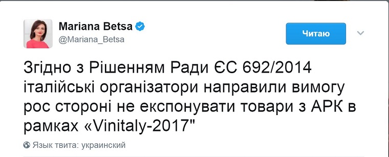 «Согласно Решению Совета ЕС 692/2014 итальянские организаторы направили требование российской стороне не экспонировать товары из АРК в рамках «Vinitaly-2017», – написала Беца в своем Twitter.