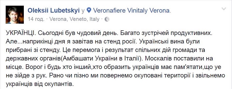 «В конце дня я посетил стенд России. Украинские вина были убраны со стенда. Это победа и результат совместных действий общественности и государственных органов (Посольства Украины в Италии)», – сообщил Любецкий.