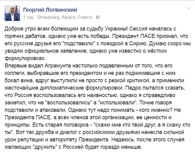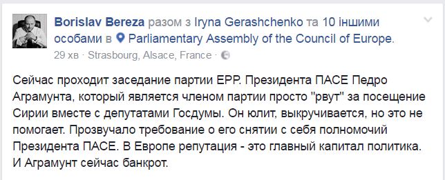 «Президента ПАСЕ Педро Аграмунта, который является членом партии просто «рвут» за посещение Сирии вместе с депутатами Госдумы. Он юлит, выкручивается, но это не помогает. Прозвучало требование о его снятии с себя полномочий Президента ПАСЕ», – написал Борислав Береза.