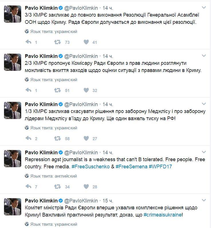 «Комитет министров Совета Европы впервые принял комплексное решение по Крыму! Важный практический результат, доказательство, что Крым ‒ это Украина», ‒ написал глава МИД.