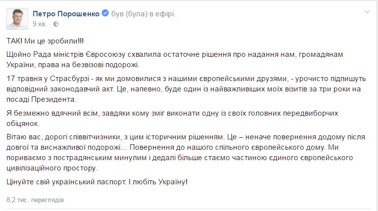 О том, что Совет министров ЕС принял решение о предоставления безвиза для Украины, сообщил на своей странице в Фейсбук президент Украины Петр Порошенко.