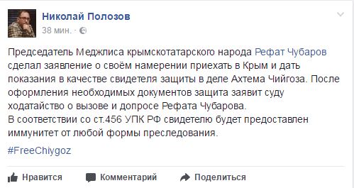 «После оформления необходимых документов защита заявит суду ходатайство о вызове и допросе Рефата Чубарова. В соответствии со ст.456 УПК РФ свидетелю будет предоставлен иммунитет от любой формы преследования», ─ написал Полозов.