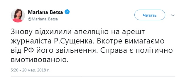 «Опять отклонили апелляцию на арест журналиста Р. Сущенко. В очередной раз требуем от РФ его освобождения. Дело политически мотивированное», — написала спикер.
