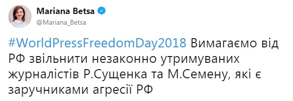 «Требуем от РФ освободить незаконно удерживаемых журналистов Романа Сущенко и Николая Семену, которые являются заложниками агрессии РФ», — написала спикер МИД.