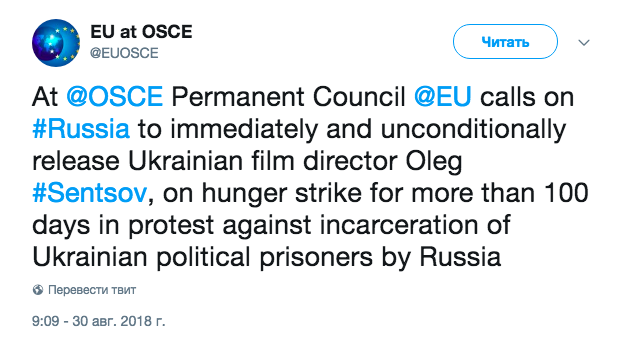 «Постоянное представительство ЕС в ОБСЕ призывает Россию немедленно и безоговорочно освободить украинского режиссера Олега Сенцова, который голодает более 100 дней против заключения украинских политзаключенных в России», — говорится в сообщении.
