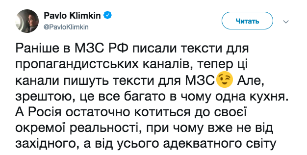 «Ранее в МИД РФ писали тексты для пропагандистских каналов, теперь эти каналы пишут тексты для МИД. Но, в конце концов, это все во многом одна кухня. А Россия окончательно катится к своей отдельной реальности, причем уже не от западного, а от всего адекватного мира», — написал Климкин.