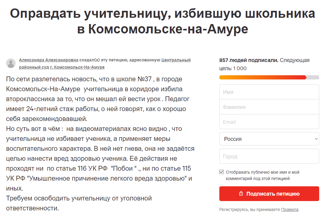 В России появилась петиция с требованием освободить от уголовной ответственности учительницу школы № 37 Комсомольска-на-Амуре Татьяну Лескову, которая избила ученика.