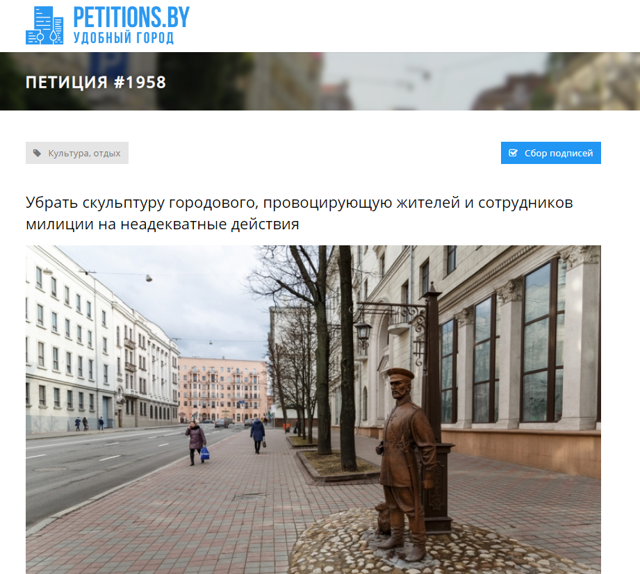 Кроме этого, в сети появилась петиция за снос скульптуры городового, так как она «провоцирует жителей и сотрудников милиции на неадекватные действия». На момент публикации этого материала под петицией подписались 1879 человек.
