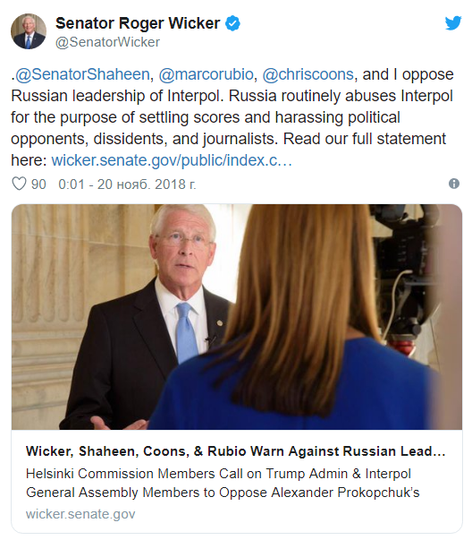 Ранее группа сенаторов США сравнила Александра Прокопчука с «лисой во главе курятника» и призвала голосовать против его назначения на пост президента Интерпола.