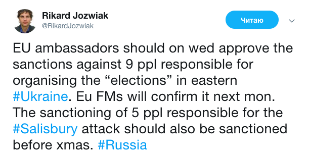 «Послы ЕС в среду должны одобрить санкции против 9 человек, ответственных за организацию «выборов» на востоке Украины. Министры иностранных дел ЕС подтвердят это решение в следующем месяце», — написал журналист.