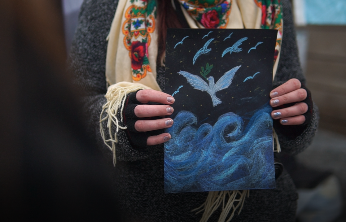 «Так как я не говорю по-русски, я нарисовала для моряков картину. Это своеобразная иллюстрация мирного неба над морем, которое штормит. Большинство чехов не говорит на русском, а те, кто знают — хотят поскорее забыть, ведь это язык оккупанта», — заявила Соня Поспишилова, организатор «Пражского Майдана».