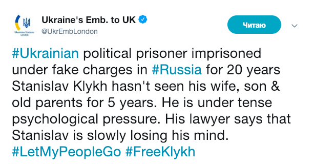 Посольство Украины в Великобритании призвало Россию освободить украинского политзаключенного Станислава Клыха.