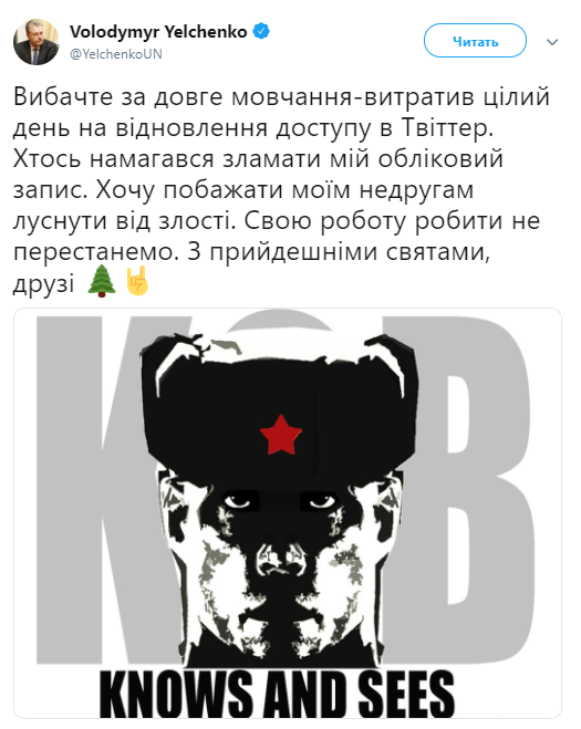 В четверг, 27 декабря, неизвестные пытались получить доступ к микроблогу Постоянного представителя Украины в ООН Владимиру Ельченко в Twitter.