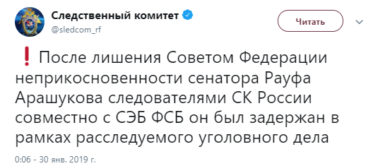 Ранее росСМИ сообщили, что 32-летнего сенатора задержали в связи с убийством, совершенным 9 лет назад. Совет Федерации снял с него неприкосновенность и дал согласие на арест. Источники заявили, что Арашукова обвинили в организации преступной группировки, убийстве двух человек и нанесении тяжкого вреда здоровью.