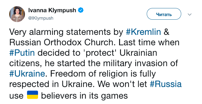 «Очень тревожные заявления Кремля и Русской православной церкви. Когда Путин в прошлый раз решил «защитить» украинских граждан, он начал военное вторжение в Украину. Свобода вероисповедания полностью уважается в Украине. Мы не позволим России использовать украинских верующих в своих играх», — заявила она.