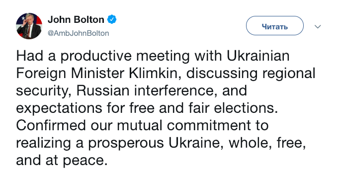 Советник президента США Дональда Трампа по вопросам национальной безопасности Джон Болтон обсудил с министром иностранных дел Украины Павлом Климкиным предстоящие выборы в Украине.
