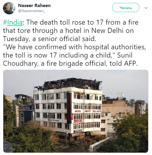В отеле Arpit Palace в центре Дели (Индия) утром 12 февраля произошел пожар, в результате которого погибли 17 человек.