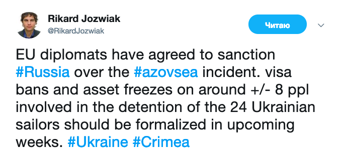 «Дипломаты ЕС договорились о санкциях против России из-за инцидента в Азовском море. Предусматривается запрет на получение виз и замораживание активов примерно для 8 человек, причастных к задержанию 24 украинских моряков, решения должны формализовать в ближайшие недели», — написал журналист.
