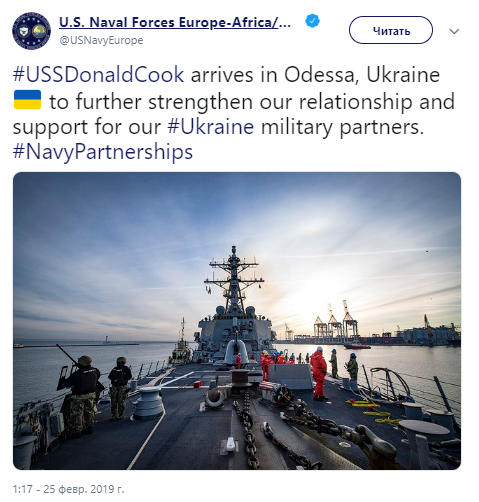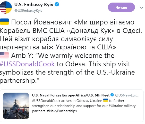 «Мы искренне приветствуем Корабль ВМС США Donald Cook в Одессе. Этот визит корабля символизирует силу партнерства между Украиной и США», — цитирует посольство слова посла США в Украине Мари Йованович.