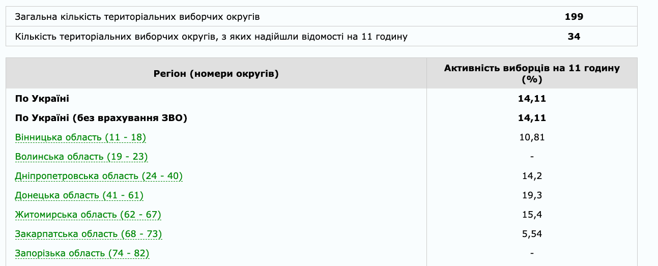 Больше всего избирателей проголосовали в Полтавской области — 23%, наименьшая явка зафиксирована в Киевской области — 4,62%.
