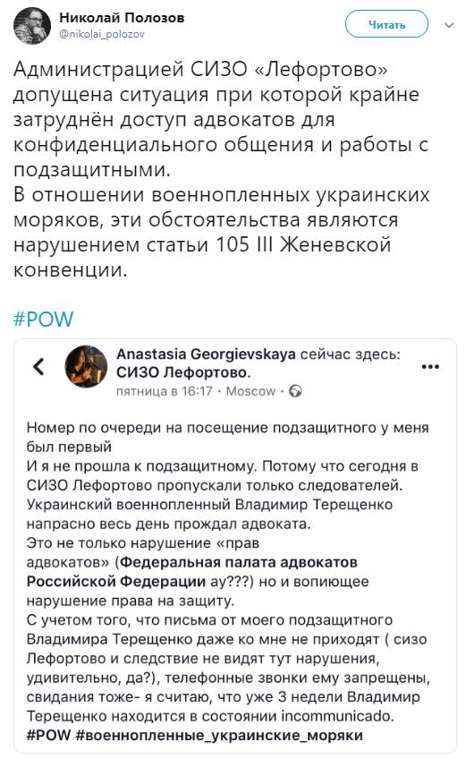 Николай Полозов также обнародовал пост адвоката Анастасии Георгиевской, в котором она сообщила, что не смогла в пятницу, 17 мая, попасть к военнопленному Владимиру Терещенко, потому что в этот день в СИЗО пропускали только следователей.