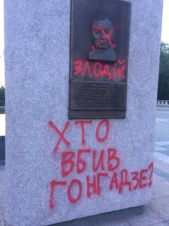 Помимо надписи «злодій», неизвестные написали на стеле «Хто вбив Гонгадзе?» («Кто убил Гонгадзе?» — ред.).
