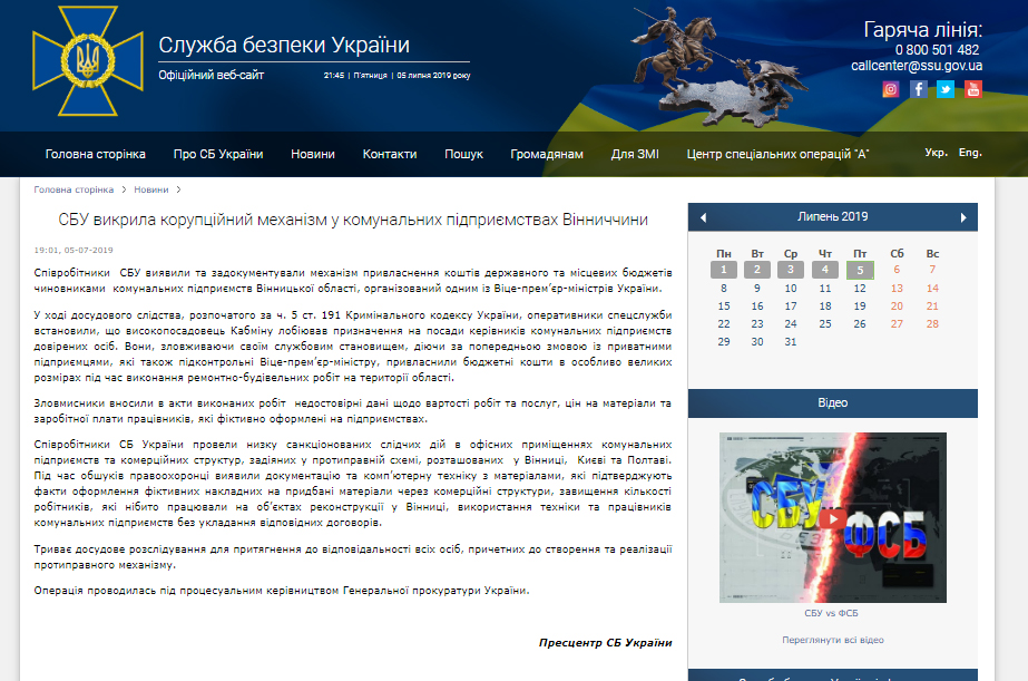 «Сотрудники СБУ выявили и задокументировали механизм присвоения средств государственного и местных бюджетов чиновниками коммунальных предприятий Винницкой области, организованный одним из вице-премьер-министров Украины. Чиновник Кабмина лоббировал назначение на должности руководителей коммунальных предприятий доверенных лиц. Они, злоупотребляя своим служебным положением, действуя по предварительному сговору с частными предпринимателями, которые также подконтрольны вице-премьер-министру, присвоили бюджетные средства в особо крупных размерах во время выполнения ремонтно-строительных работ на территории области», — сообщали в спецслужбе.