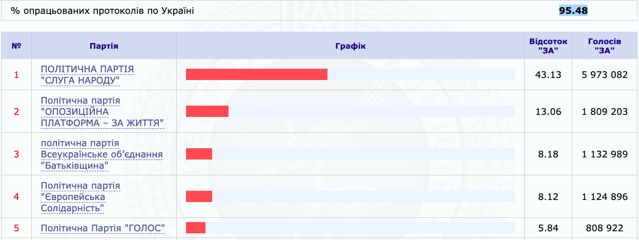 По данным, обнародованным на сайте комиссии, 43.13% избирателей проголосовали за партию «Слуга народа», 13,06% — за «Оппозиционную платформу — За жизнь», 8,18% — за «Батькивщину», 8,12% — за «Европейскую солидарность», 5,84% — за «Голос».