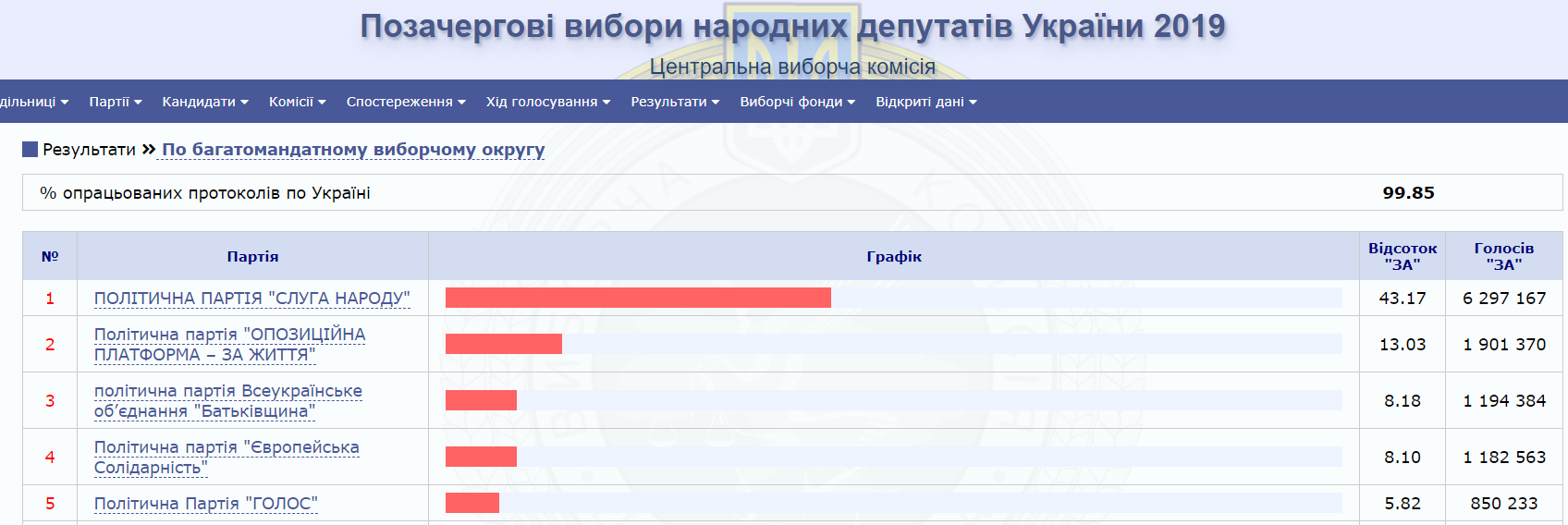 Центральная избирательная комиссия обработала 99,85% электронных протоколов по итогам голосования в многомандатном общегосударственном избирательном округе на внеочередных выборах народных депутатов Украины.