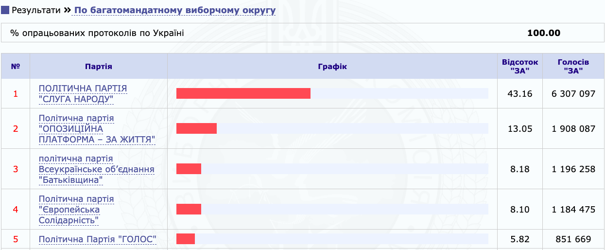 Партия «Слуга народа» набирает 43,16% голосов, за «Оппозиционную платформу — За жизнь» проголосовали 13,05%, «Батькивщина» — 8,18%, «Европейская солидарность» — 8,10% и «Голос» — 5,82%. Остальные партии набрали менее 5% голосов и не проходят в Верховную Раду.