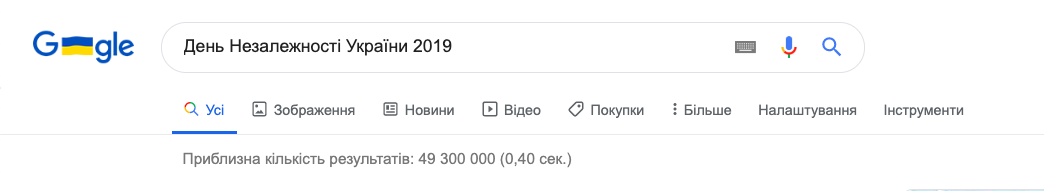 На картинке изображен сине-желтый флаг. Если на него нажать, открывается поиск по ключевым словам «День Незалежності України 2019».