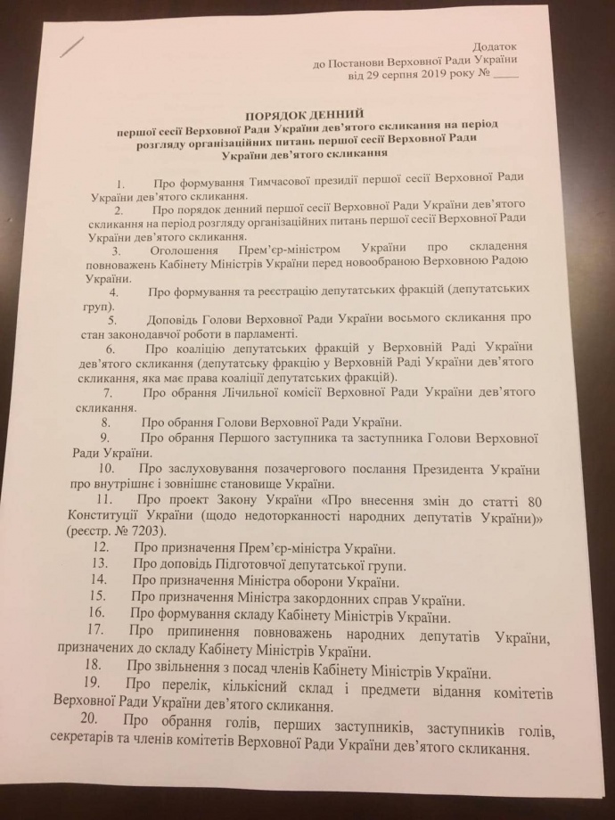 Подготовительная группа по организации первого заседания Верховной Рады утвердила повестку первого дня работы парламента 29 августа.