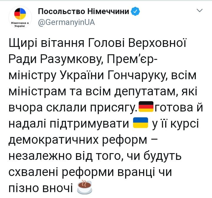 «Искренние поздравления главе Верховной Рады Разумкову, премьер-министру Украины Гончаруку, всем министрам и всем депутатам, которые вчера приняли присягу. Германия готова и в дальнейшем поддерживать Украину в ее курсе демократических реформ — независимо от того, будут одобрены реформы утром или поздно ночью», —  говорится в сообщении.