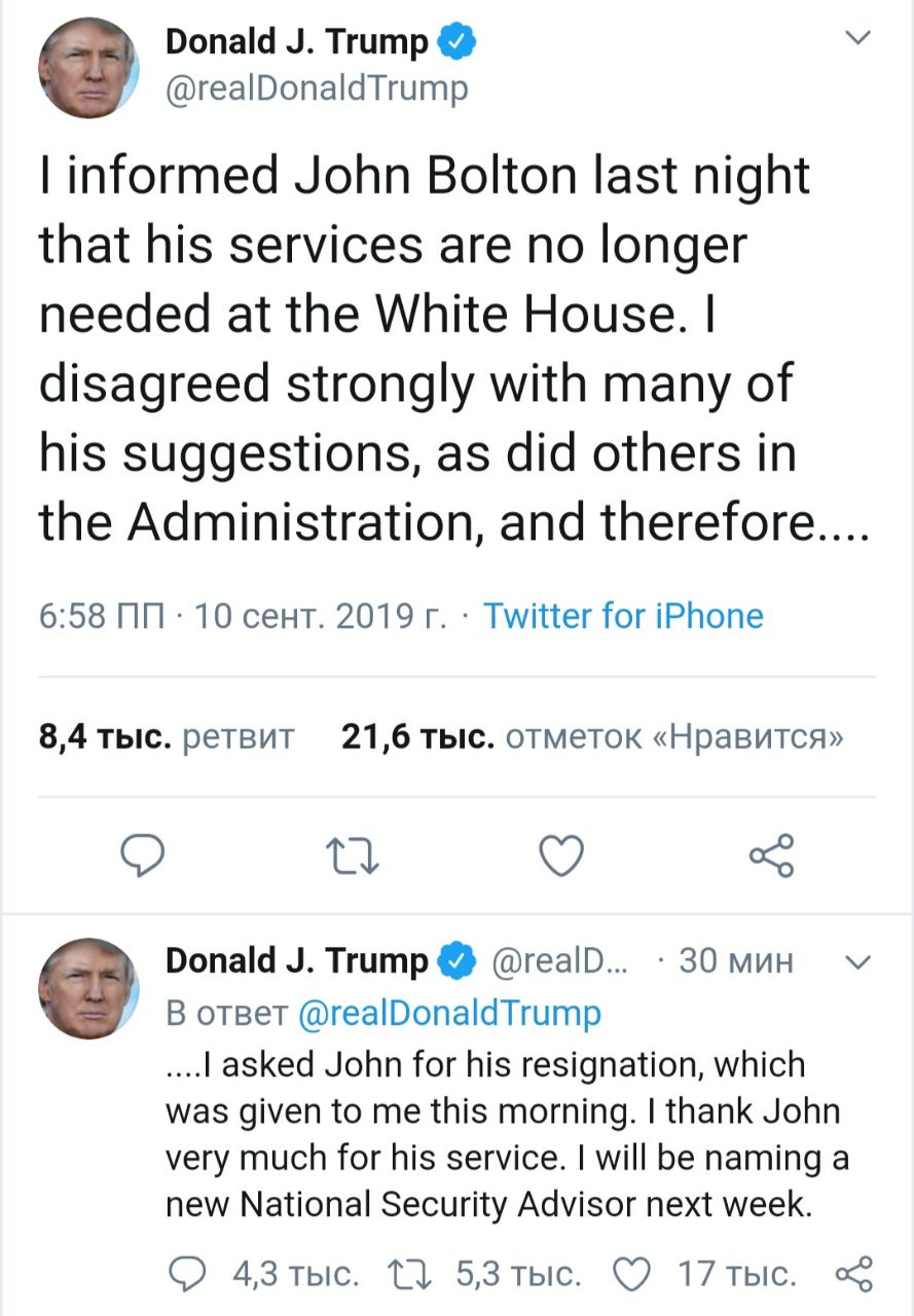 «Я предложил уйти в отставку вчера вечером, и президент Трамп сказал: «Давай поговорим об этом завтра», —  написал Болтон в Twitter.