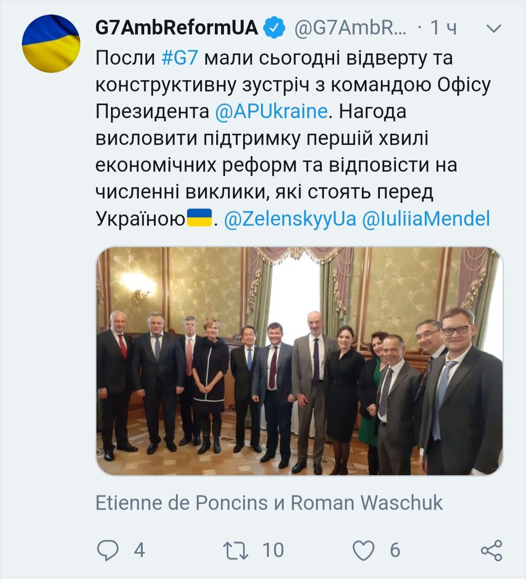 «Послы G7 имели сегодня откровенную и конструктивную встречу с командой Офиса президента. Возможность выразить поддержку первой волне экономических реформ и ответить на многочисленные вызовы, которые стоят перед Украиной», — указано в сообщении.