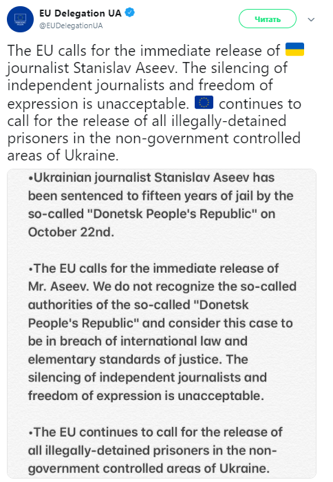 «ЕС призывает к немедленному освобождению журналиста Станислава Асеева. Молчание независимых журналистов и свобода выражения недопустимы. Евросоюз продолжает призывать к освобождению всех незаконно задержанных заключенных на неподконтрольных Украине территориях», — говорится в сообщении.