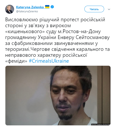 «Выражаем решительный протест российской стороне в связи с приговором «карманного» суда Ростова-на-Дону гражданину Украины Энверу Сейтосманову по сфабрикованным обвинениям в терроризме. Очередное свидетельство карательного и неправового характера российской «фемиды». Крым — это Украина», — отметила она.